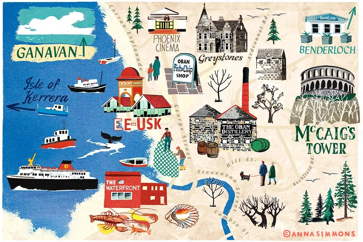 I set the scene for this illustrated map of Oban, Scotland deep in winter. I wanted to evoke the feeling of a coastal walk followed by a warming glass of whiskey (from Oban Distillery), perhaps in an old, stone B&B, combining nature, industry, and local culture. Fishing boats, a ferry to Mull, and a whale in the sea highlight the maritime life, while deep evergreen trees and warm reds give a bracing wintery walk a cosy touch.