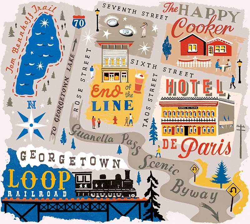 The digital collage technique enabled me to seamlessly pull elements together, creating a layered, textured effect that added depth to each map. I chose retro lettering styles that reflected each town's distinct history, culture, and character. This blend of colour, texture, and lettering ensured that each map was both a portrait of a place and a visual guide, helping readers navigate the text in the feature.
