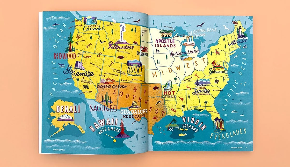 A full-page double-page map illustrating national parks across the United States, designed to give readers clear orientation and bring regional highlights to life. This type of location-based visual supports navigation, enhances storytelling, and works seamlessly in illustration for non-fiction and covers projects.